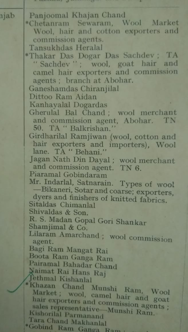 साईं राम प्रकाश खुंगर के पिता हरीश चंद्र खुंगर की फर्म हरीश खुंगर दी हट्टी के नाम से प्रसिद्ध रही है…साईं राम प्रकाश बताते हैं कि उस समय इलाके में खजान चंद मुंशी राम, किशोरी लाल परमानंद, तारा चंद मक्खन लाल, गोबिन्द राम गंगा राम की फर्म ऊन बाजार में थी और काफी मशहूर थी…उस समय मै. खजान चंद मुंशी राम और गोबिन्द राम गंगा राम को स्टार मिला था…जिसका जिक्र England से प्रकाशित पुस्तक इंडिया एंड पाकिस्तान वूल हौजरी एंड फैब्रिक में किया गया था…